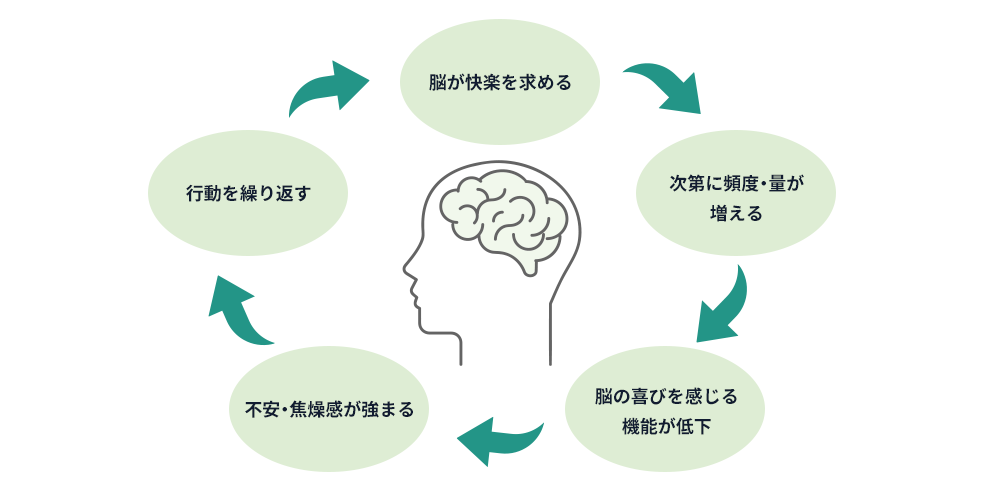 まずお伝えしたいのは、依存症は「心の弱さ」ではなく、「脳の病気」だということです。脳の中の仕組みに変化が起こり、理性よりも「欲求」が強く働いてしまうのです。
