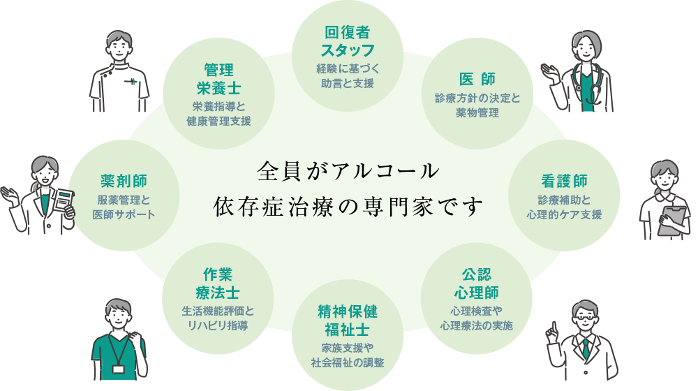 依存症は手術や薬だけでは改善できない病気のため、医師だけでの治療では十分ではありません。当院では、患者さんを中心に、医師・看護師・公認心理師・作業療法士・薬剤師・管理栄養士・回復経験者など、多職種がチームとなって支えます。さらに、断酒会や12ステップグループの協力も得ながら、多面的に回復をサポートしています。